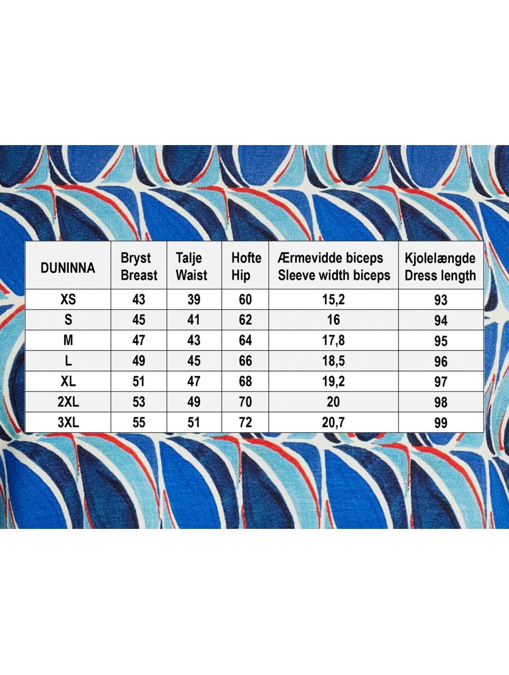 DUNINNA modellen har en flot pasform til alle kvindekroppe. Modellen er syet i baner som fremhæver barmen og taljen og dernæst tilføres der en del vidde over maven som gør, at den skjuler evt. "ømme" steder på kroppen.