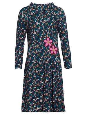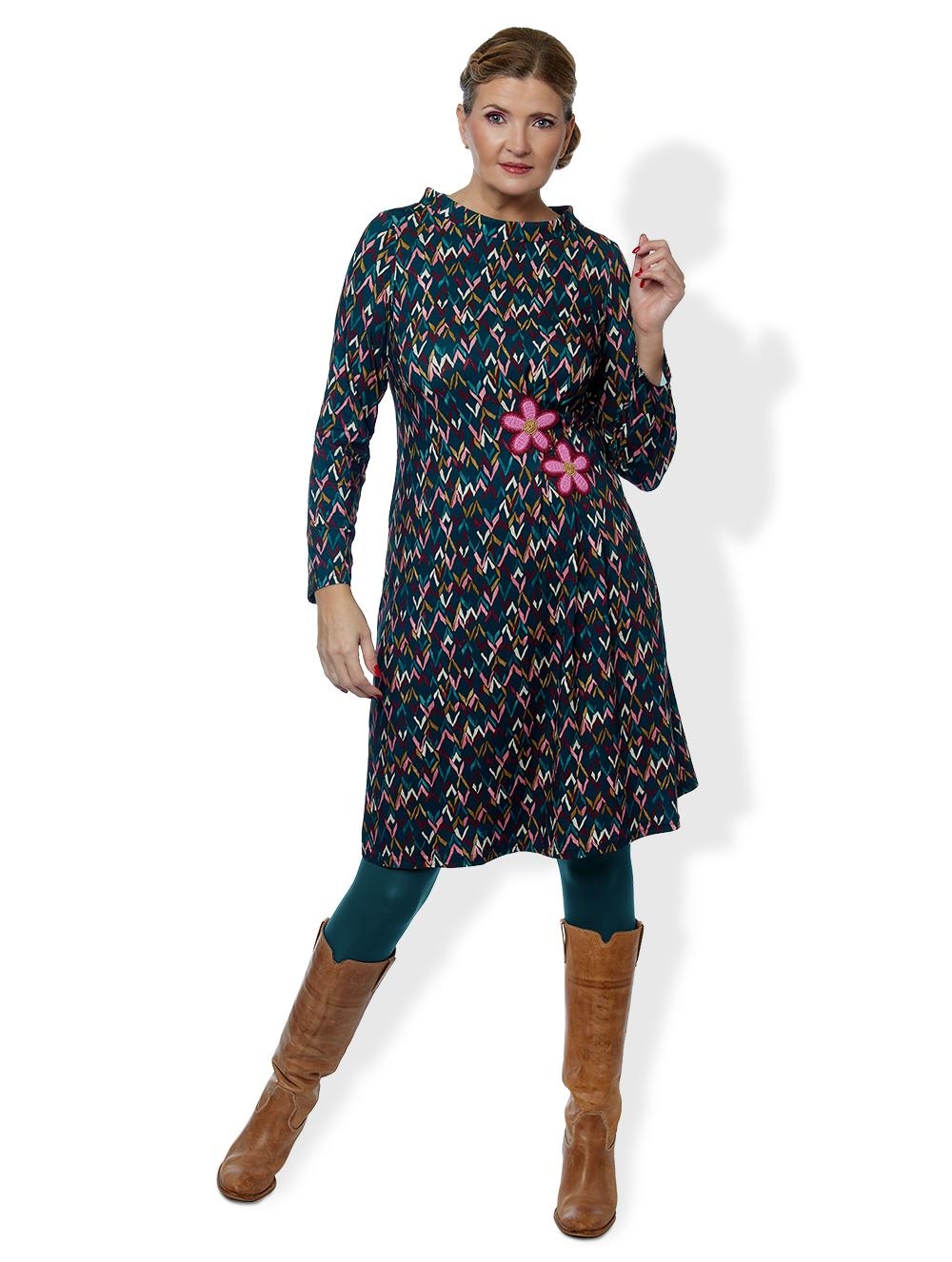Skøn kjole med det fineste mønster i farverne petrol, rosa, khaki og dark cherry.